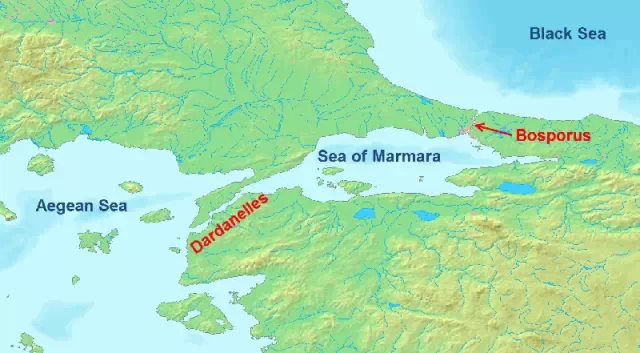 ⑷ 土耳其海峡(Turkish Straits)。又称黑海海峡,由博斯普鲁斯海峡、马尔马拉海、达达尼尔海峡三部分组成。是黑海与地中海之间唯一的通道,也是亚洲和欧洲的分界线。