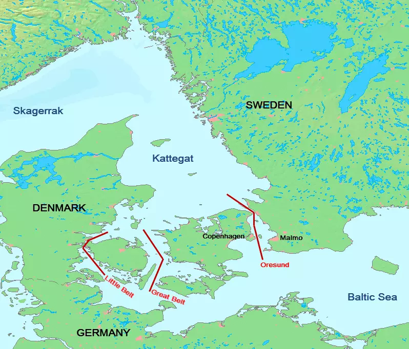 ⑶ 丹麦海峡(Danish Straits)。经由卡特加特海峡和斯卡格拉克海峡连接波罗的海和北海。
