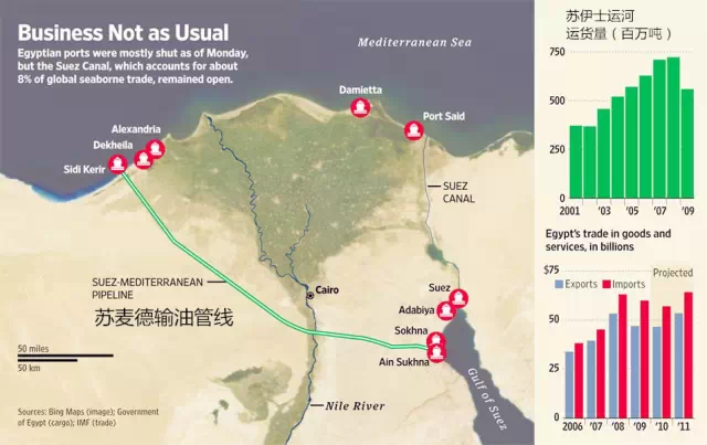 ⑴ 苏伊士运河和苏麦德输油管线(Suez Canal and SUMED Pipeline)。国际通航运河,也是亚非两洲的分界线。在埃及东北部,贯通苏伊士地峡,连接地中海和红海,全长193.3公里。
