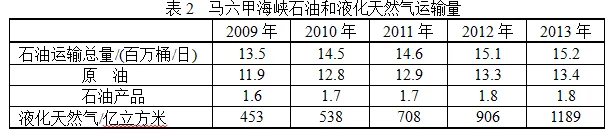 马六甲海峡是亚洲关键峡口,估计2009年日通过1350万桶,2013年增长到日通过1520万桶,原油一般占年流总量的90%,石油产品约占10%。