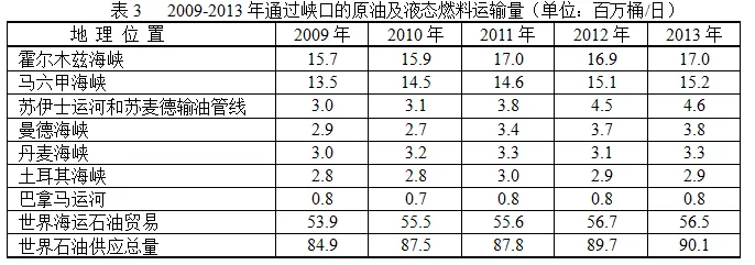 根据美国能源情报署的数据,霍尔木兹海峡和马六甲海峡是世界上最重要的峡口,另外还有5条也很重要,其运输量见表3。