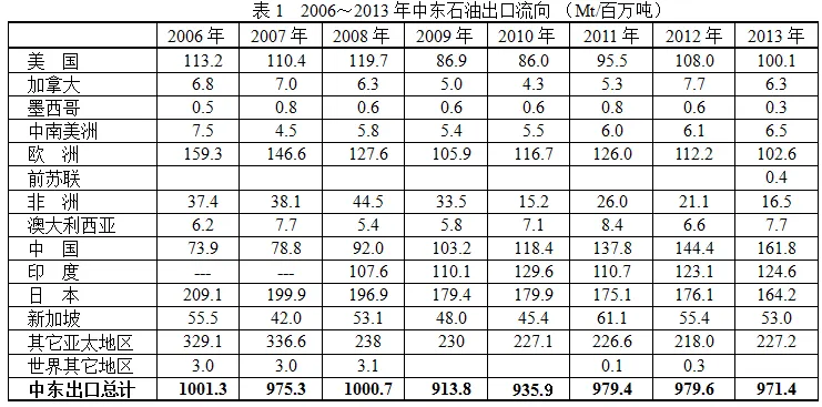 表1是中东石油经由霍尔木兹海峡的流向,可以看出中美印日是中东石油的最大接收国,这四个国家2013年占总量的57%。