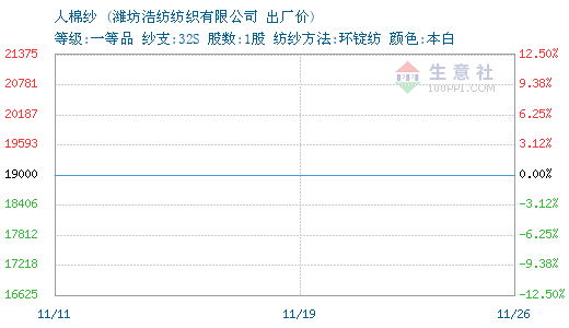 11月26日潍坊浩纺纺织有限公司关于人棉纱的报价为19000元/吨。人棉纱的出产地为山东潍坊;仓储地为山东省;人棉纱的属性:等级:一等品;纱支:32S;股数:1股;纺纱方法:环锭纺;颜色:本白。该报价有效期为3天。