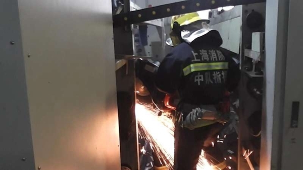 图说:消防人员 利用破拆工具对外部滚轴进行切割。金山消防供图