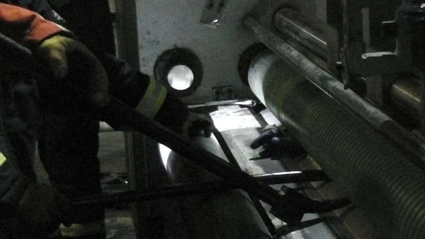 到达现场后,经侦查发现,一名中年男子右手被卡在压板机两个滚轴之间。根据现场情况,消防官兵使用液压扩张器尝试将滚轴进行扩张,因滚轴间缝隙狭小且没有支点可以支撑扩张器。尝试无效后,现场指挥员立即更换救援方案,利用破拆工具对外部滚轴进行切割,剪掉传动皮带,卸掉齿轮,拆卸压板机的加固螺丝及外部挡板,再利用液压扩张器在滚轴间进行扩张。经过近50分钟的紧张救援,成功将男子右手取出并送医 。